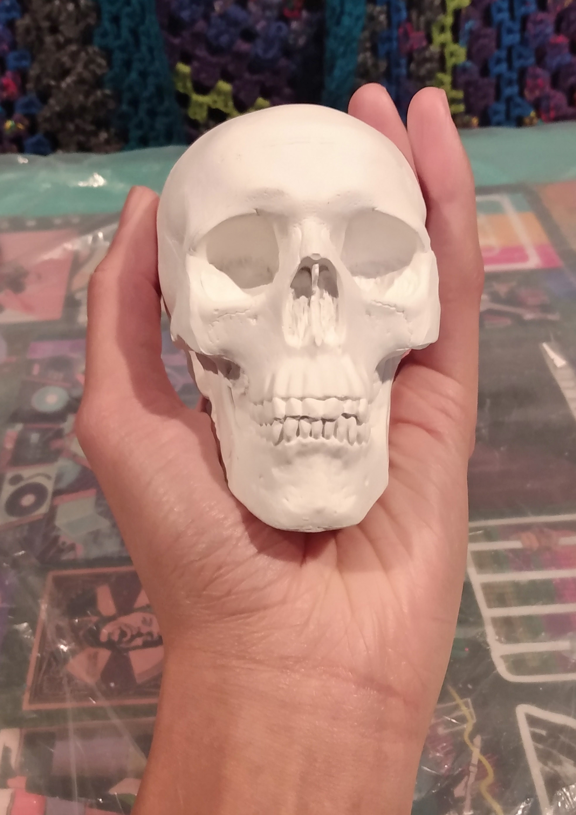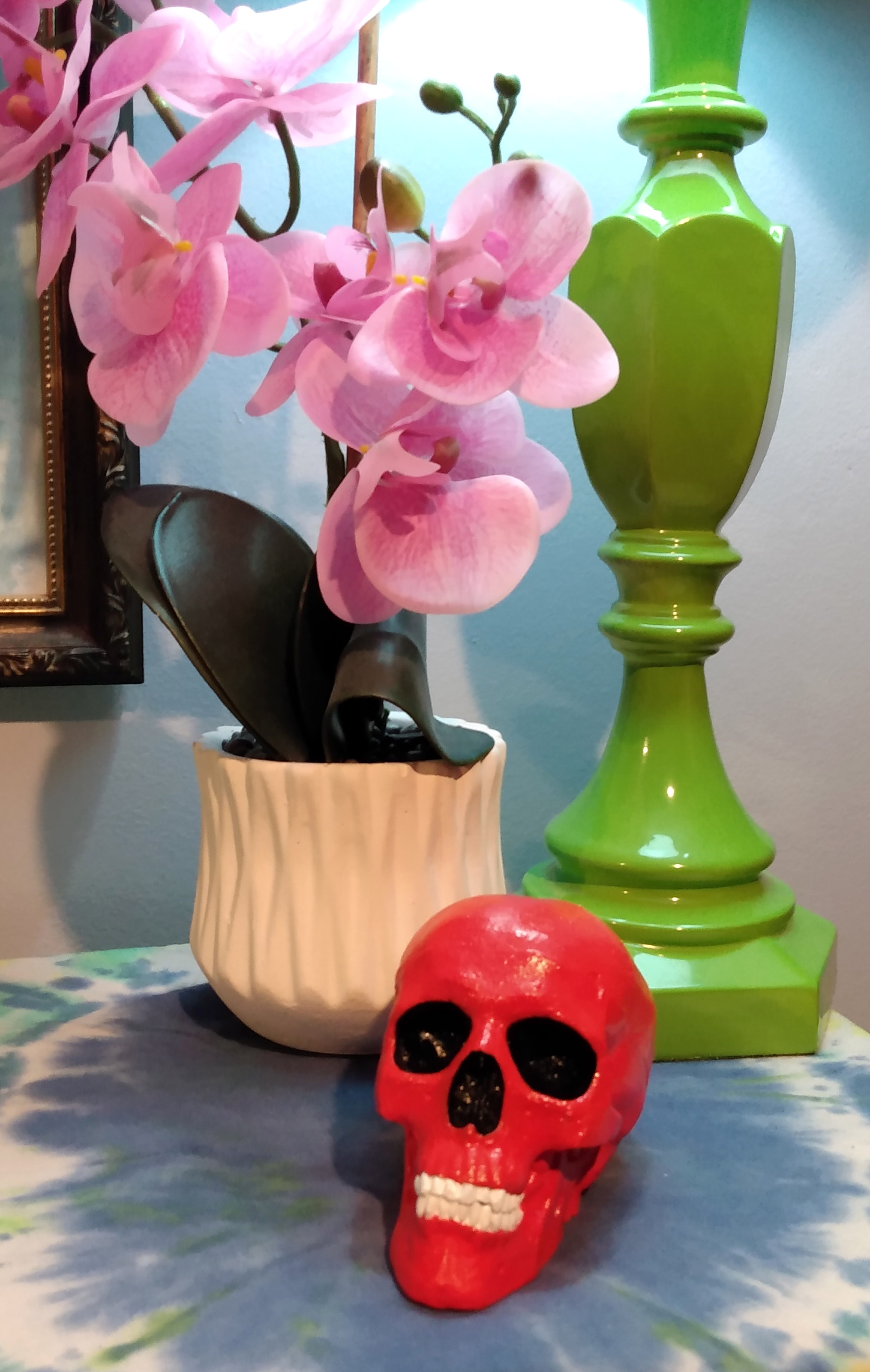 My mother bought me this skull piece for birthday back in October. Not sure what it’s made of but it’s heavy and took the paint well. I had no ideas beyond wanting a bold color for this spot on top of my piano. Finished it with a gloss. I think it turned out cute.
